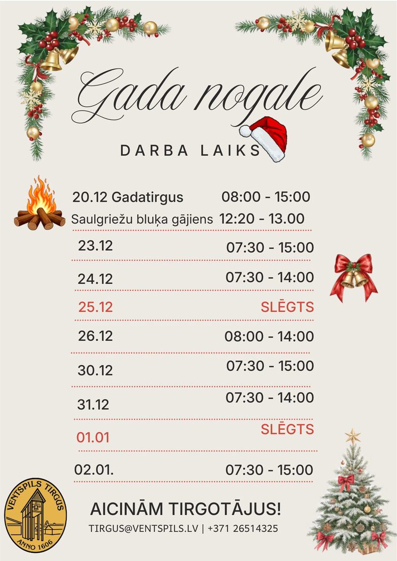 Ziemassvētku gaisma un Jaungada brīnums piepilda decembri un jaunā - 2025.gada pirmo dienu ar siltumu un kopā būšanu. Ventspils tirgus aicina svētkus sagaidīt ar vietējiem gardumiem, dāvanām un sirsnību. Lai atvieglotu Jūsu svētku plānus, esam apkopojuši darba laikus un īpašos notikumus šajā laikā.