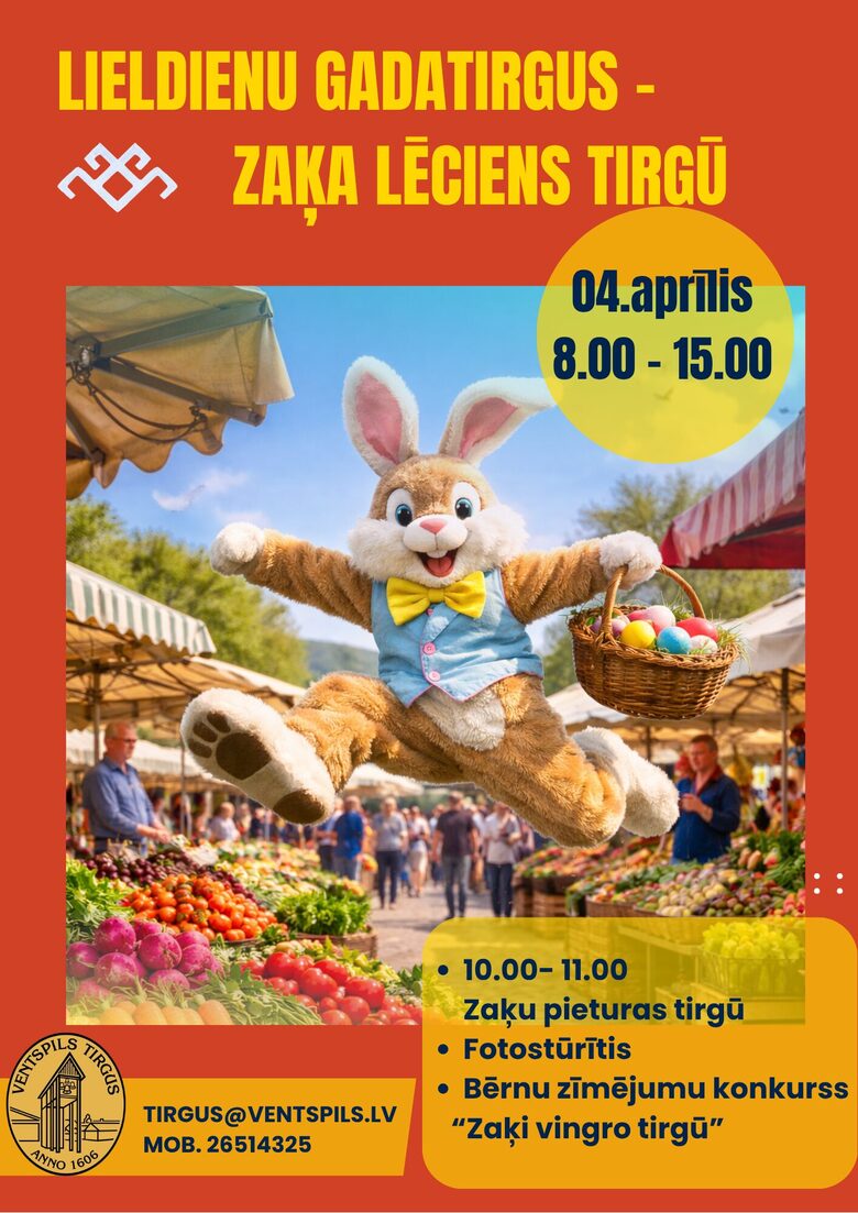 Sestdien, 4. aprīlī, no plkst. 8.00 līdz 15.00 Ventspils tirgū notiks Lieldienu gadatirgus, kur vienuviet varēs iegādāties svētku gardumus, vietējo ražotāju produkciju, stādus un amatnieku darbus, kā arī piedalīties svētku aktivitātēs ģimenēm ar bērniem.