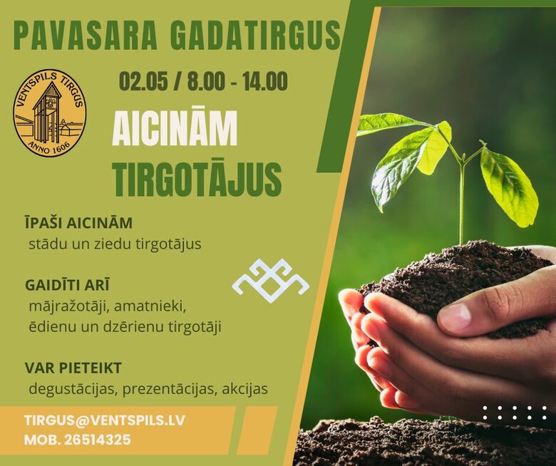 Sestdien, 2.maijā no plkst. 8.00 līdz 14.00 Ventspils tirgū notiks Pavasara gadatirgus, uz kuru aicinām pieteikties tirgotājus.