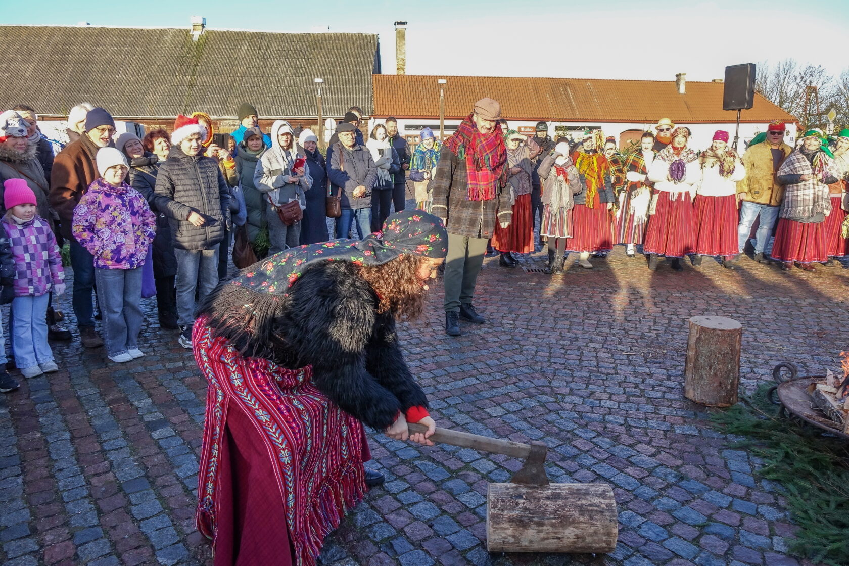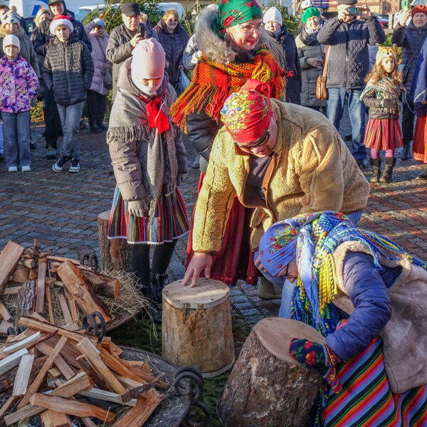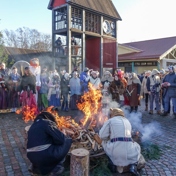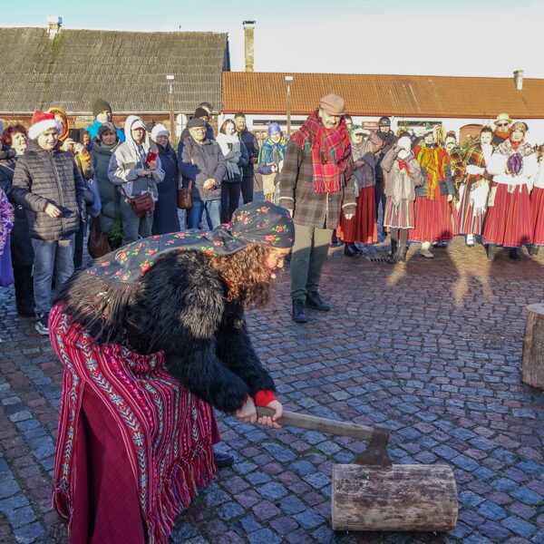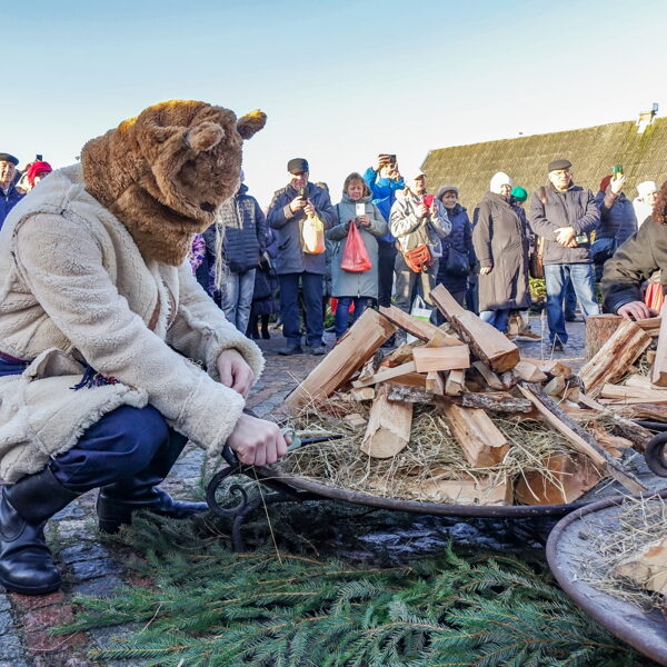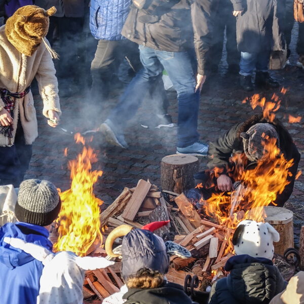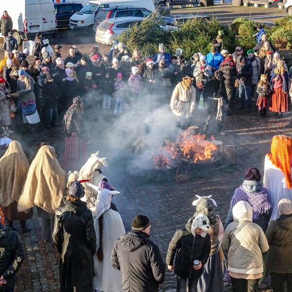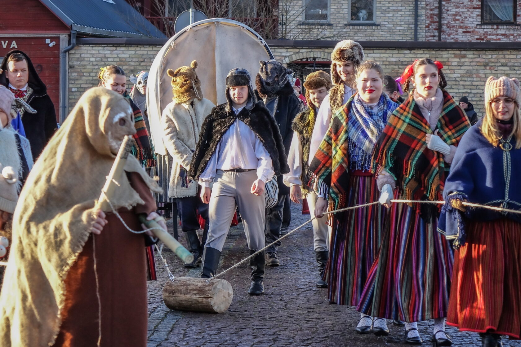 Tradicionālajā bluķa vilkšanā dalībnieki vienojās kopīgās dziesmās, dejās un uguns rituālos, velkot bluķi cauri pilsētai līdz Vecpilsētas Tirgus laukumam.