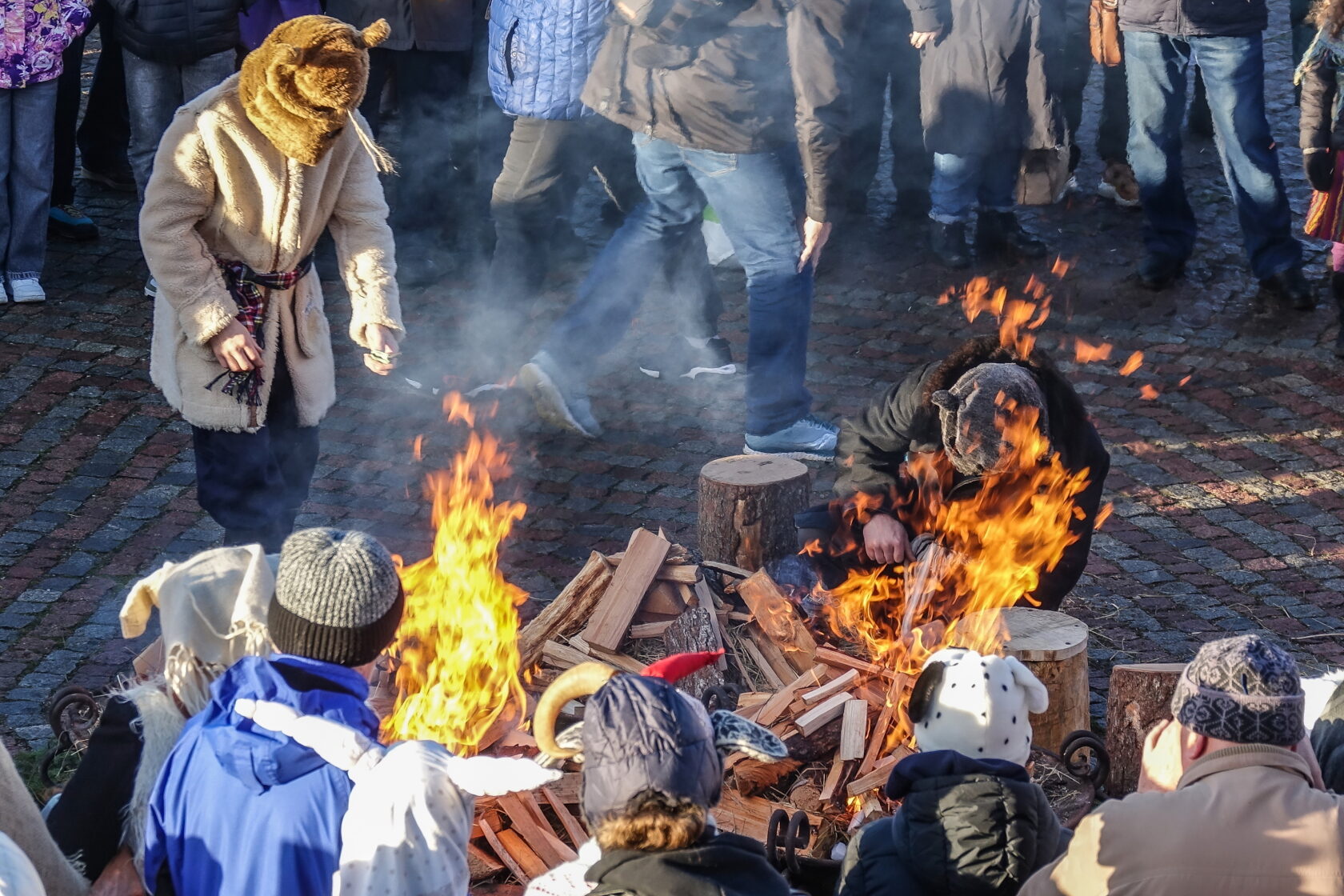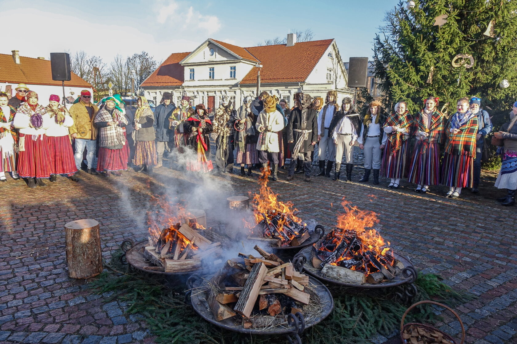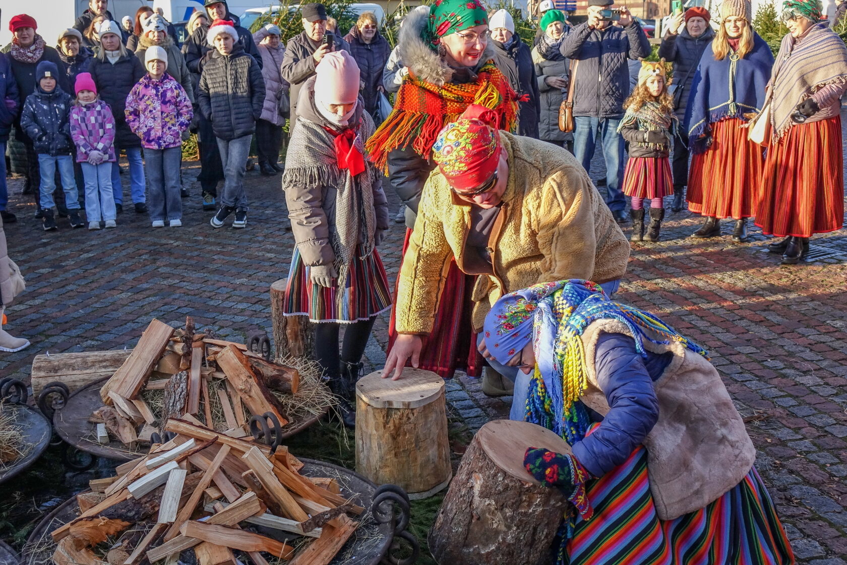 Tradicionālajā bluķa vilkšanā dalībnieki vienojās kopīgās dziesmās, dejās un uguns rituālos, velkot bluķi cauri pilsētai līdz Vecpilsētas Tirgus laukumam.