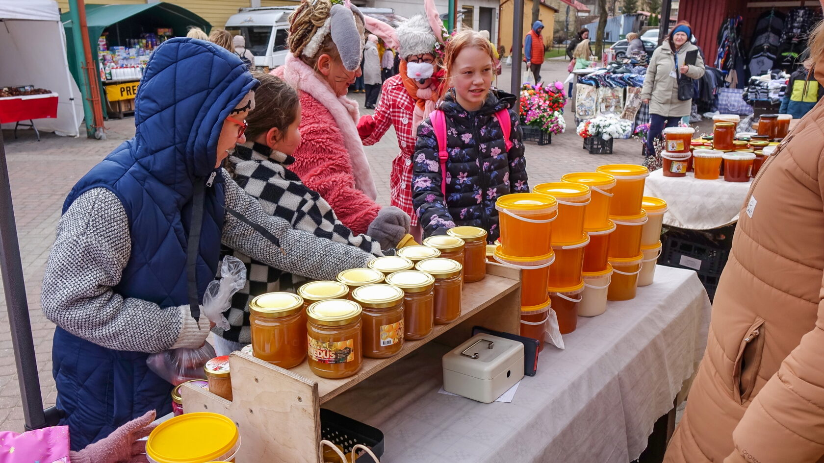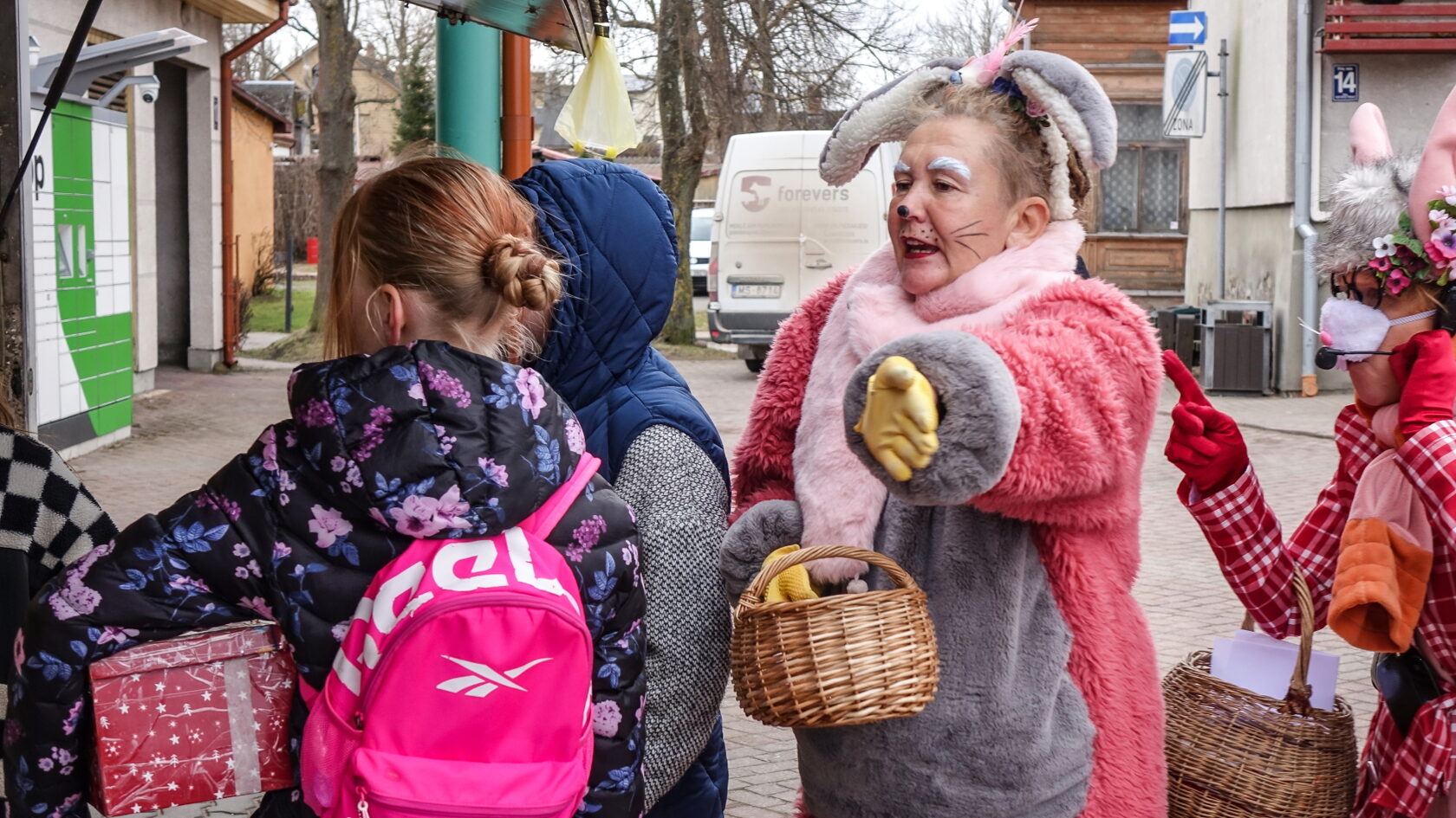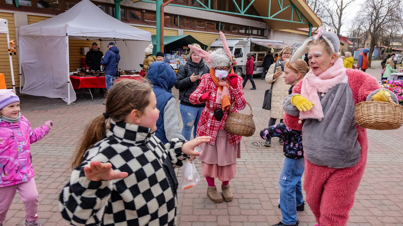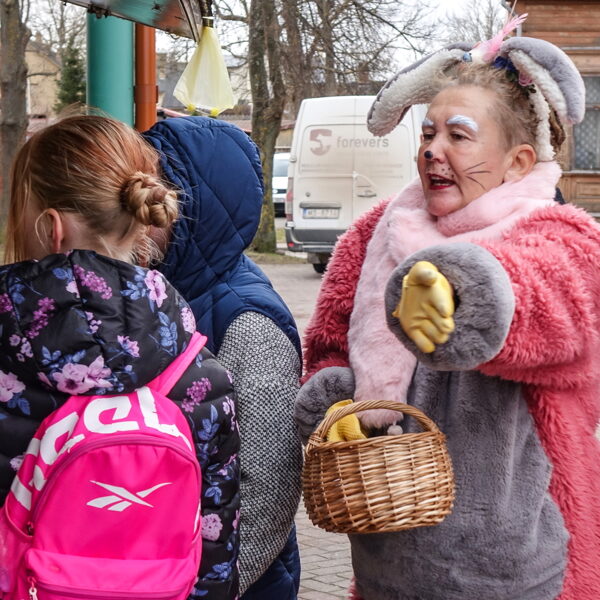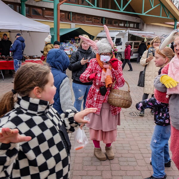 Bērni bija atnesuši zīmējumus un kopā ar zaķiem apmeklēja tirgotāju stendus, izpildot vingrojumus.