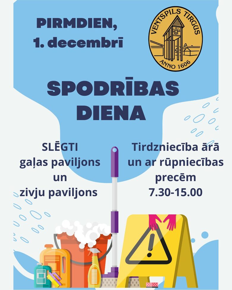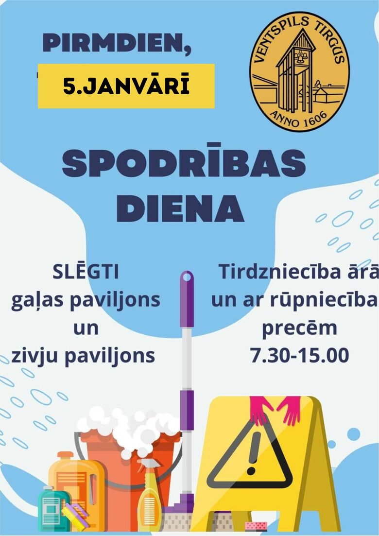 Ventspils tirgus informē, ka turpmāk, sākot ar oktobri, reizi mēnesī, katra mēneša pirmajā pirmdienā, apmeklētājiem būs slēgti Pārtikas un Zivju paviljoni. Tie tiks uzkopti, ieviešot Sanitāro (tīrības) dienu. Pirmo reizi tā notiks pirmdien, 7. oktobrī.